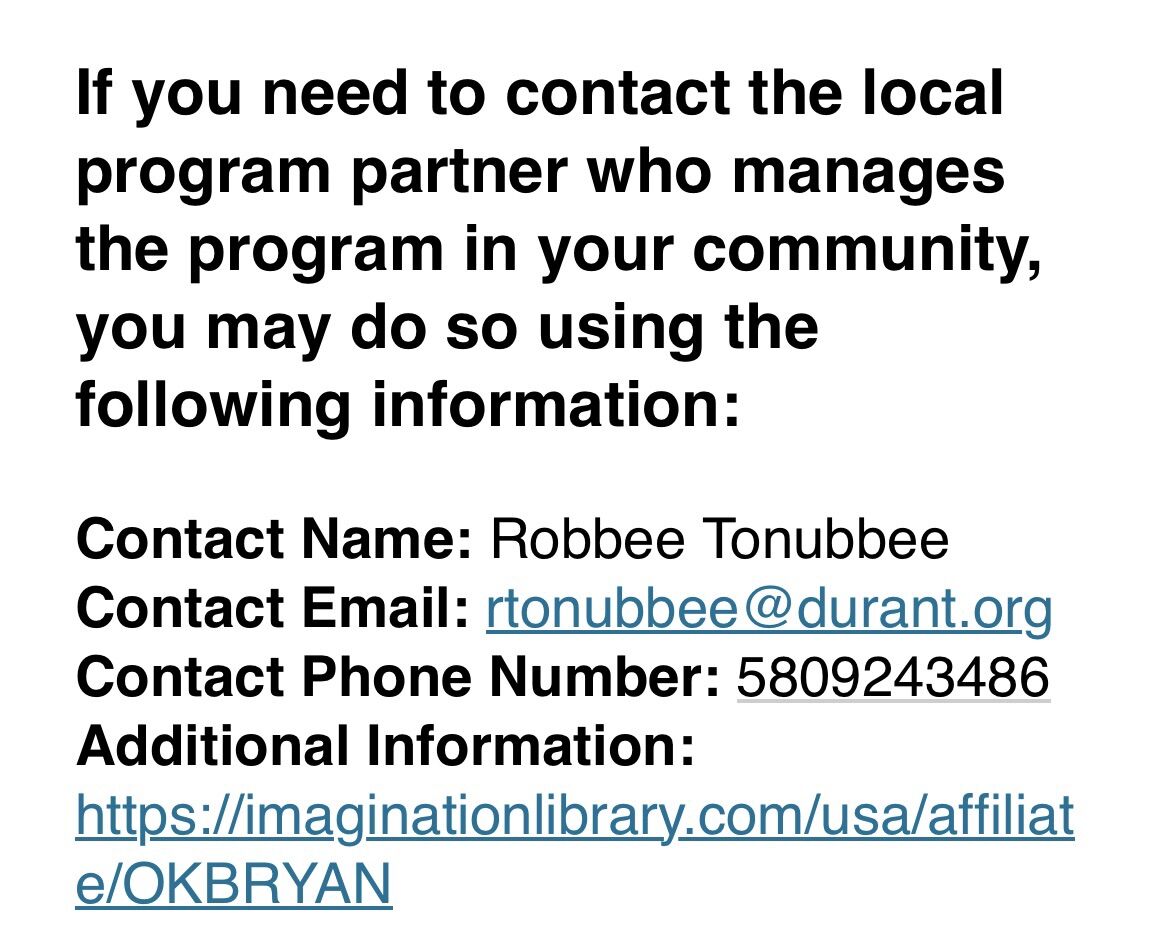 Parents if you have tried to sign up for Imagination Library and were not accepted to due to being in the wrong location please email Robbee Tonubbee. She helped get mine straightened out for my d...