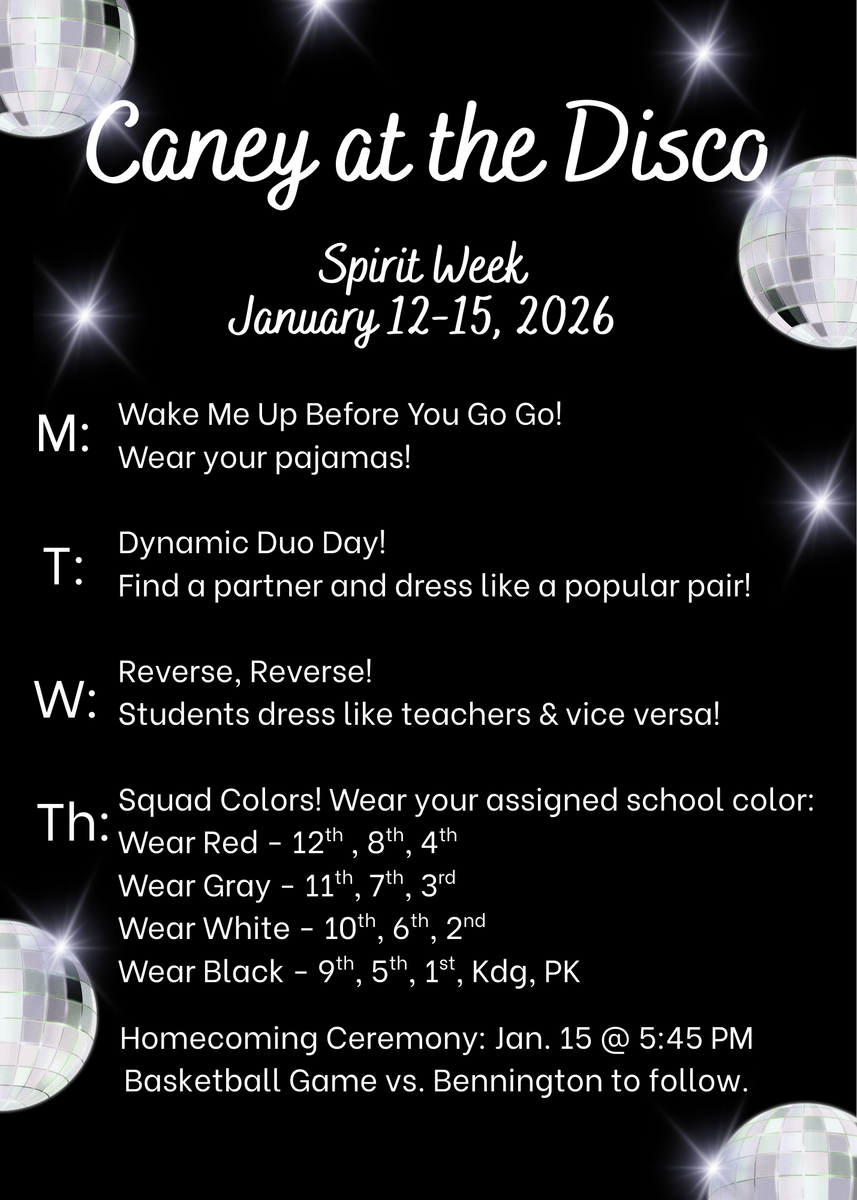 🪩🕺Homecoming 2026 will be here before we know it, January 12-15. Check out the Spirit Week Dress Up Days in the attached photo! (Information about Homecoming TShirts is coming soon!)